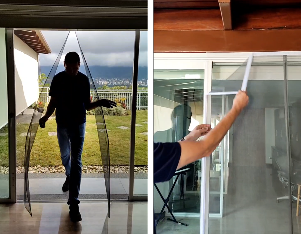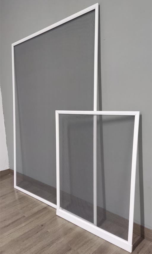 Mosquiteros fabricados con malla de fibra de vidrio, marcos de PVC con imán flexible que permite fijarlo de manera sencilla en marcos ferrosos, también puede fijarse en marcos no ferrosos colocando una cinta de imán flexible autoadhesiva con un pegamento extra fuerte.